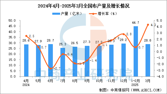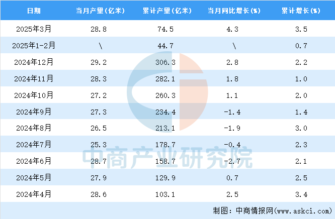 中商谍报网讯:据中商财产研究院数据库显示,2025年3月全国布当月产量取客岁同期比拟增加。2025年1-3月全国布产量74。5亿米,同比增加3。5%。